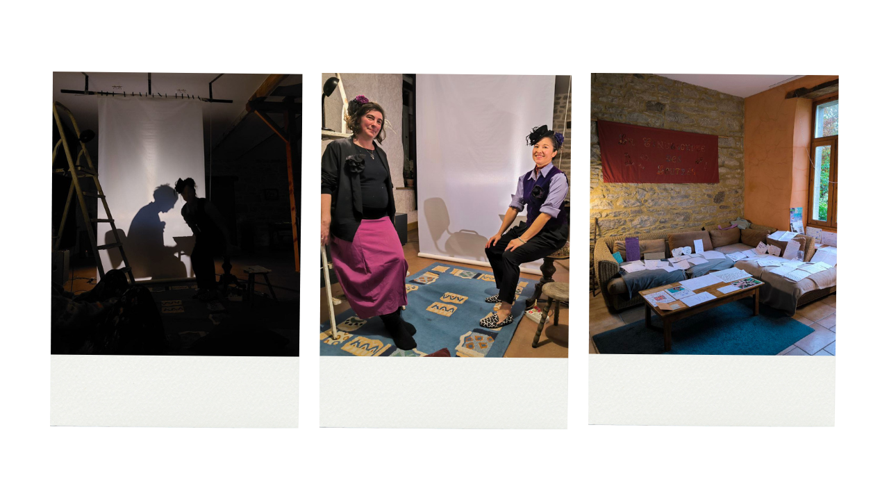 Claire et moi pendant notre première sortie de résidence et une mise en exposition et une mise à disposition d’une partie de nos archives de tous les écrits et collages faits par des femmes lors de nos ateliers depuis 3 ans.